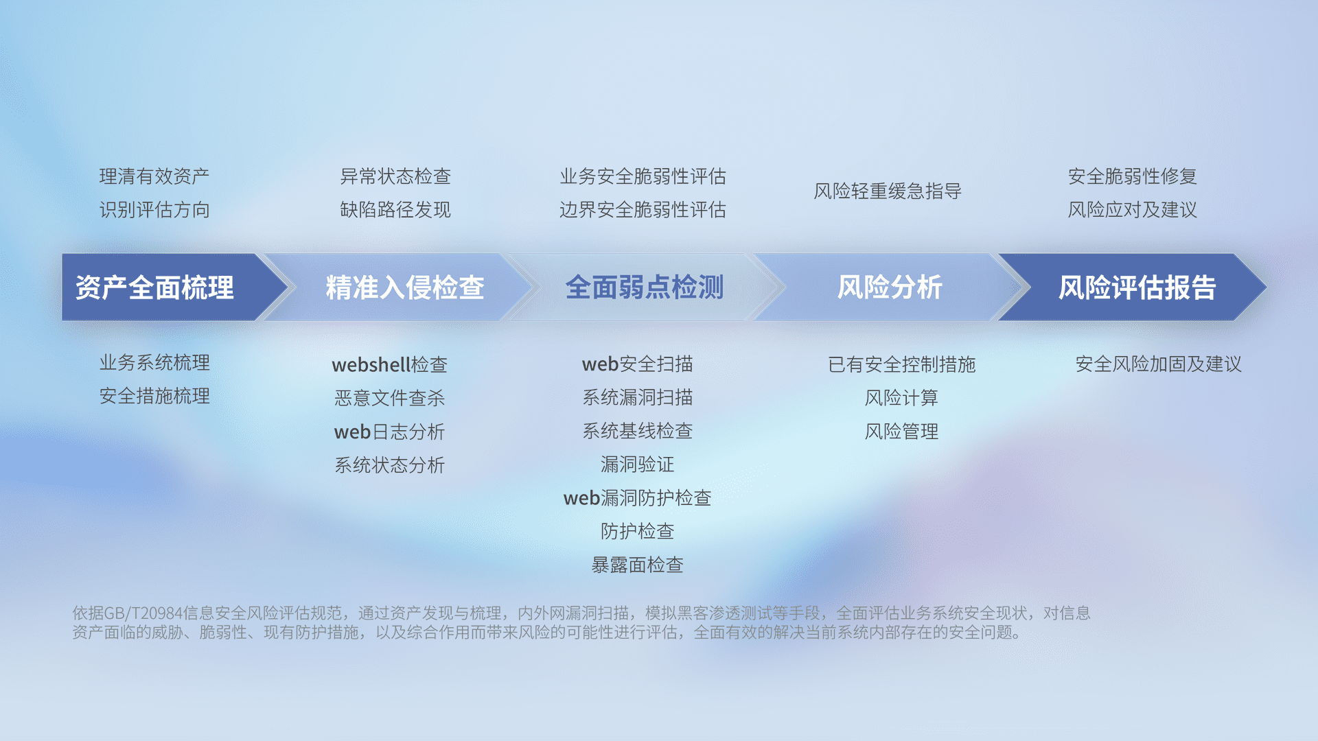 针对客户行业特性,,以专业的安全服务+多厂商联合解决方案提供专属的一站式安全管理服务,,,帮助客户全面感知网络空间威胁,,基于识别、、、检测、、、、分析、、、、防护、、监测、、、响应的服务理论模型,,从方案咨询、、、、集成交付、、评估验证、、、、优化加固、、运维运营,,,致力于为客户提供完整的闭环管理式安全服务。。。。以实战经验为客户打造高抵御风险的安全体系,,,,帮助客户发现威胁、、、、对抗威胁、、处置威胁,,不断积累安全对抗能力,,,,持续保障数字化安全。。。。