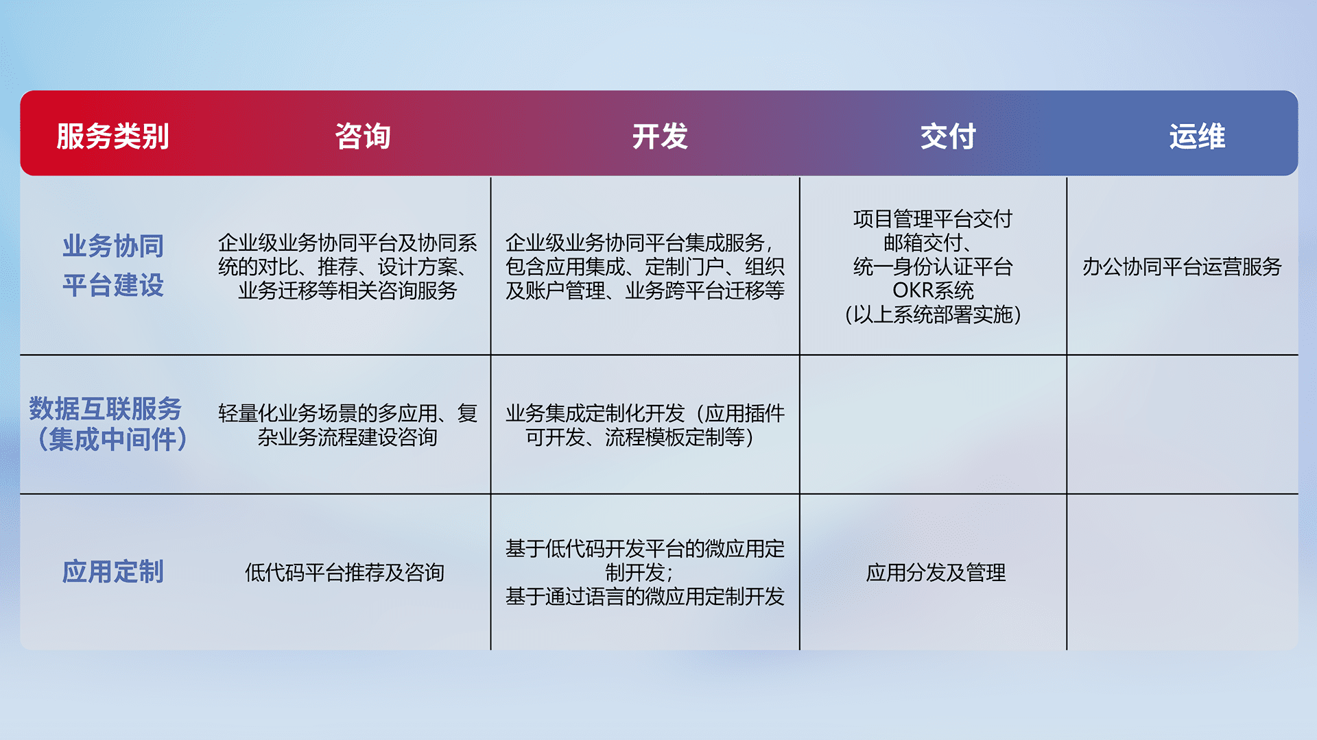 针对钉钉、、、、企微、、、IDaas等平台级产品提供产品的规划、、、、方案、、、交付、、、、定制化开发等服务,,实现如统一协同办公、、、、智能客户服务、、混合会议管理、、、智能数据查询、、等业务场景,,,实现数字化转型。。。